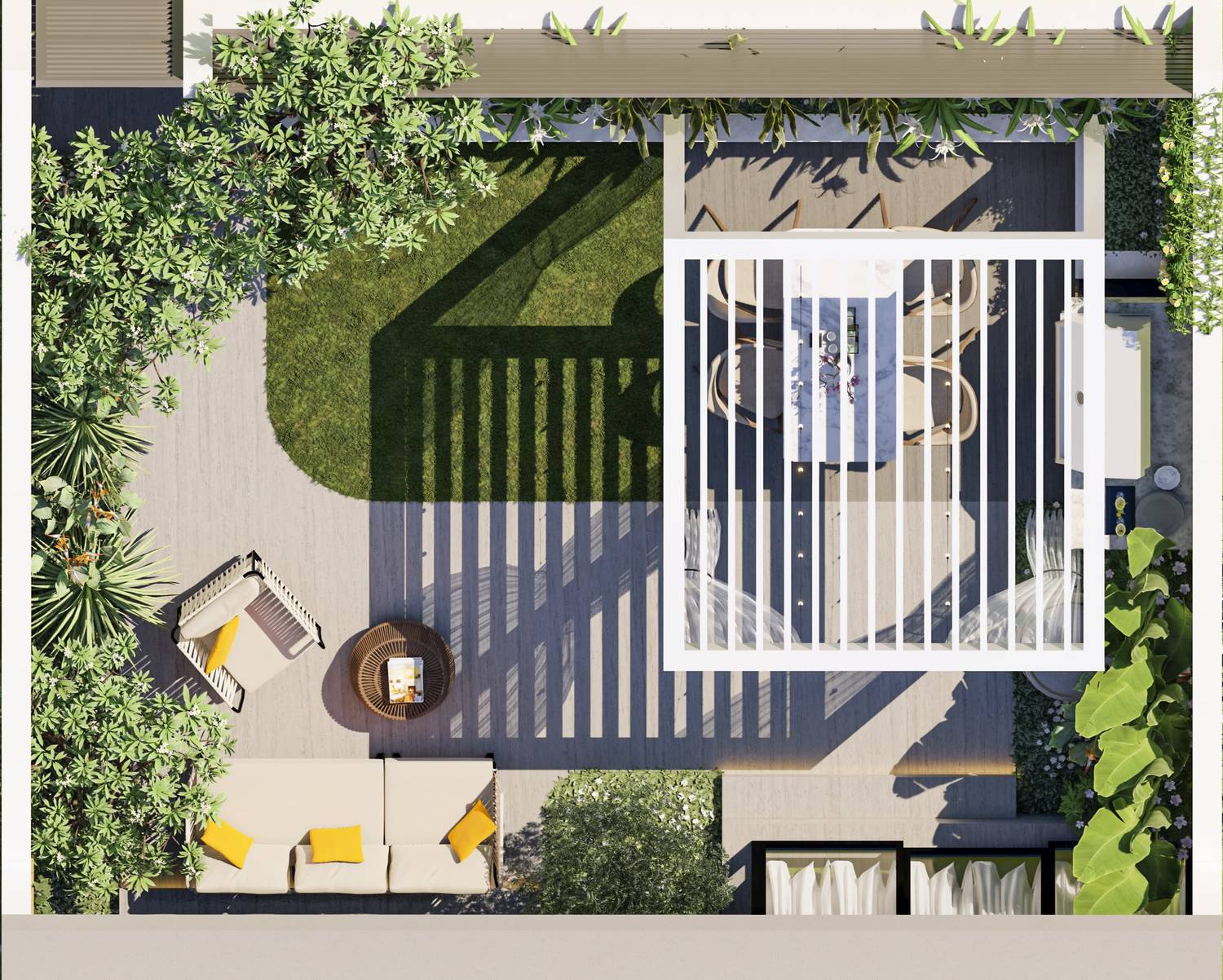 how did we do it? through careful consideration of the design elements, we added curves, a tropical planting theme, subtle ambient lighting, and a water feature at the entrance to create a tranquil and inviting atmosphere. the dated brown aluminum pergola was elegantly transformed into a luxurious white structure, complete with dining seating and a fixed barbecue counter for effortless al fresco dining experiences. 🍝